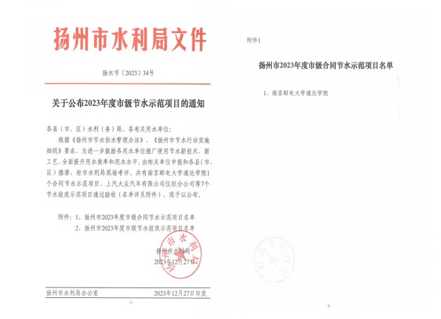 近日,扬州市水利局发布《关于公布2023年度市级节水示范项目的通知》(扬节水〔2023〕34号)文件,taptap点点获评“扬州市2023年度市级合同节水示范项目”称号。该荣誉经扬州市水利局现场考评,具有引领示范和典型带动效应的合同节水示范作用,学院入围扬州市唯一高校合同节水示范项目单位。