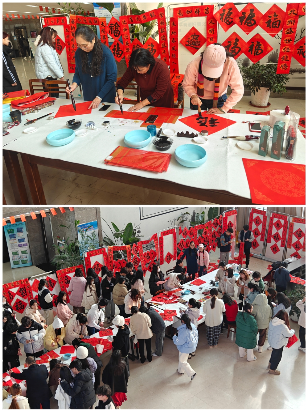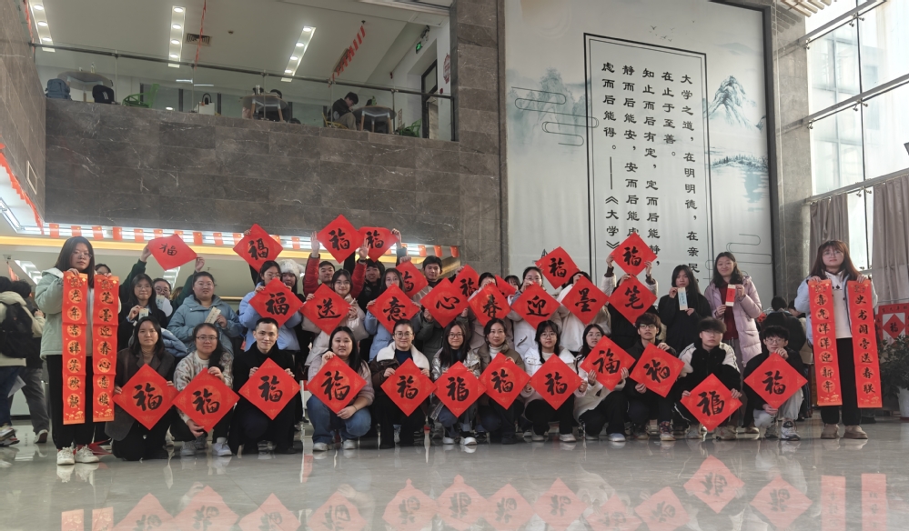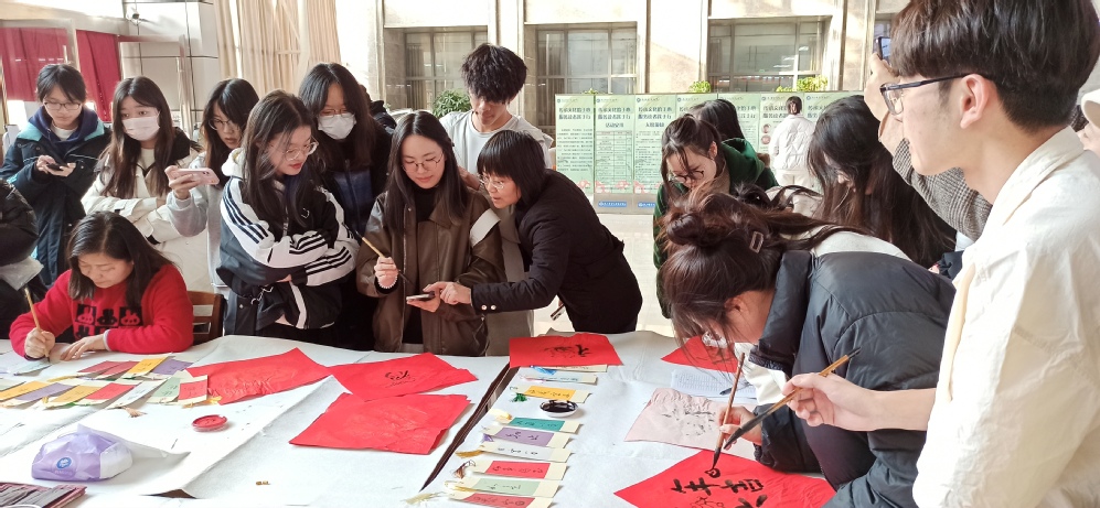 院长王国平欣然赠送活动祝福:“史书阁旁送春联,喜气洋洋迎新年,笔墨迎春心意暖,龙年吉祥笑欢颜”。党委书记赵允玉与师生共写“福”字,整个图书馆墨香洋溢,充盈着新春气息,欢乐祥和、喜庆热烈。活动共送出春联、“福”字和祝福书签500余幅。
