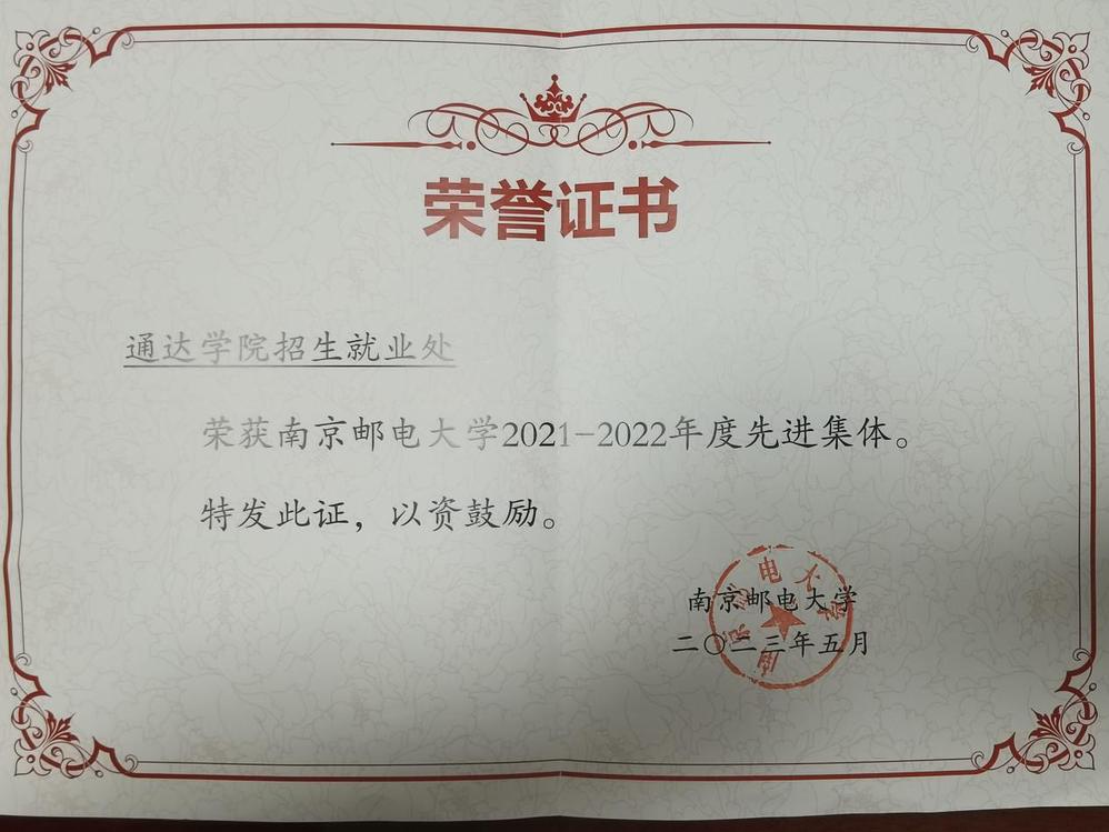 4.学生工作再创佳绩:2023届毕业生升学率16.05%,共有406名同学被录取为国内外硕士研究生,国内考研人数和出国留学人数均取得好成绩。生源质量稳步提升,2023年招生录取最低分物理类(不限)较2022年提高了2个名次。招生就业处获评“南京邮电大学 2021-2022年度先进集体”。学院连续两年获评“2022年高校毕业生就业工作量化考核A等高校”。人武工作创新推进,学院获批扬州市首批“优质兵员储备基地”。学院在省学生资助工作绩效考核中获评“优秀”,1名老师获得“江苏省优秀资助工作者”荣誉称号。