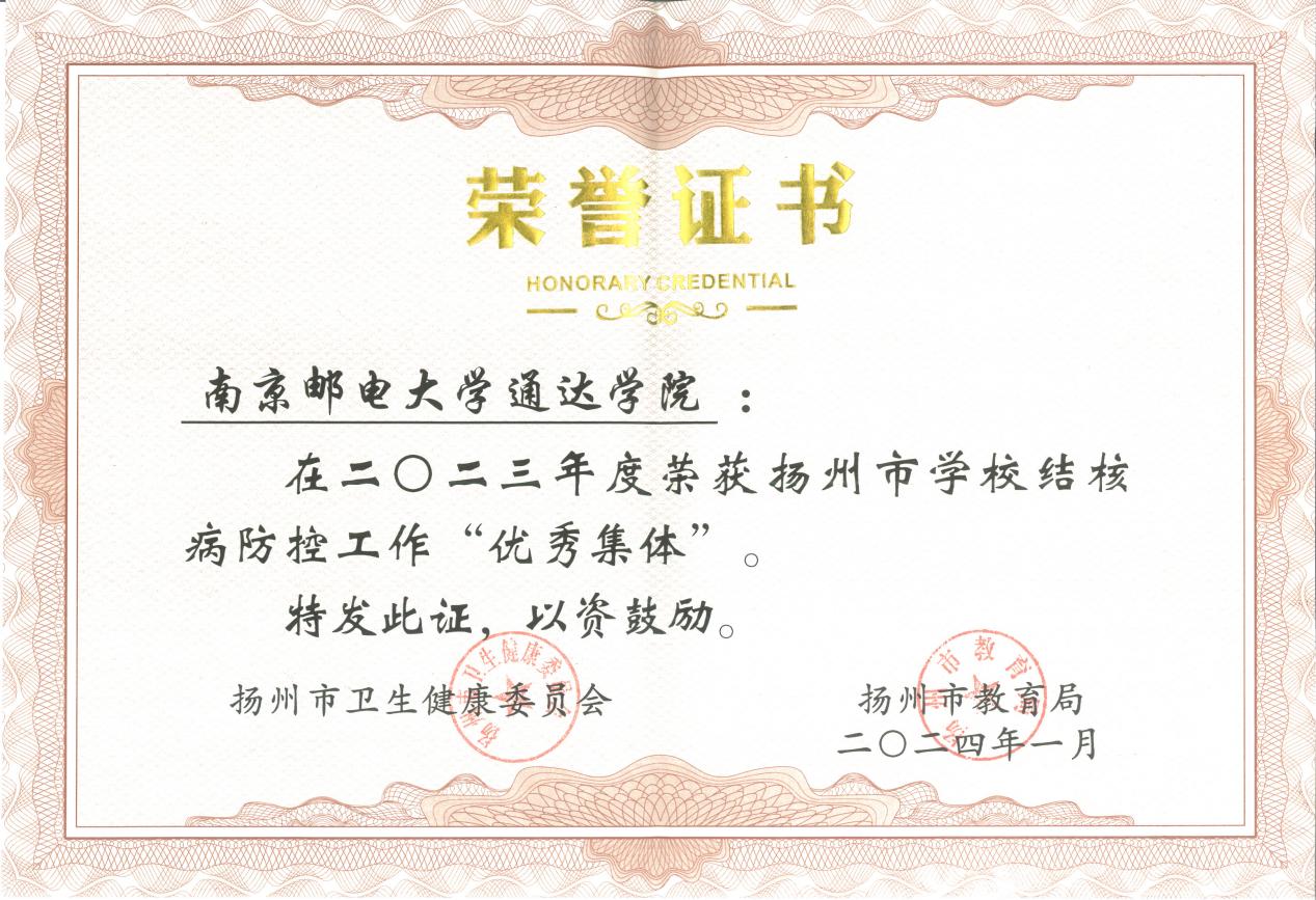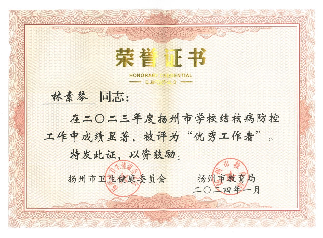 近日,扬州市卫生健康委员会、扬州市教育局对2023年度在学校结核病防治工作中做出突出成绩的优秀集体、优秀工作者予以表彰。taptap点点体育被评为优秀集体,后勤管理处林素琴荣获扬州市2023年度学校结核病防治工作“优秀工作者”。