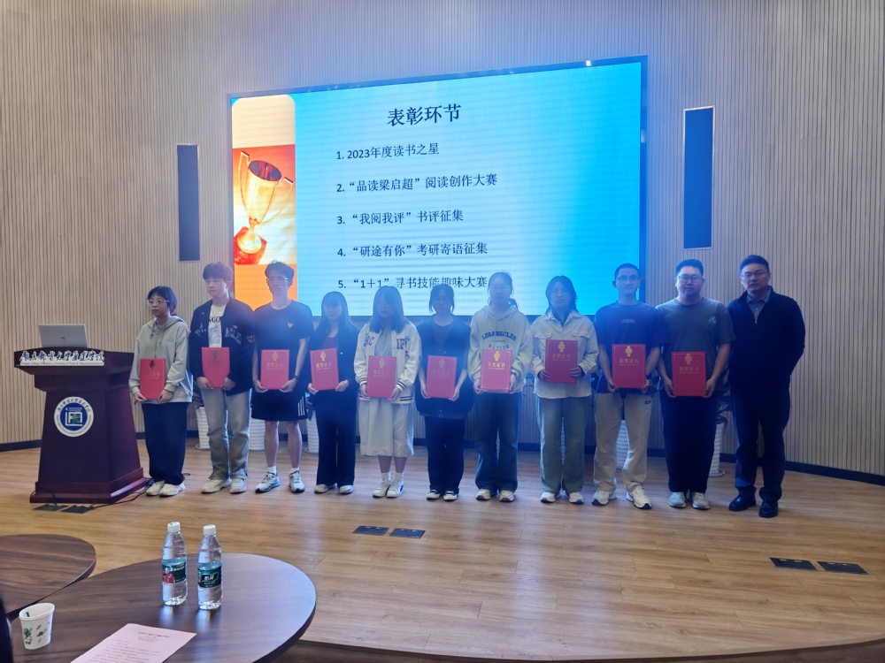在总结表彰环节,张伟副院长亲自为2023年度读书之星以及阅读创作大赛、书评征集活动、考研寄语征集活动、寻书技能趣味大赛中脱颖而出的获奖者们颁发证书和奖品。紧接着,“读书之星”支卉作为学生代表上台发言,她深情分享了自己的阅读感悟,并表达了与同学们共同利用图书馆这一知识宝库,不断积累知识、拓宽视野、启迪智慧的强烈愿望。