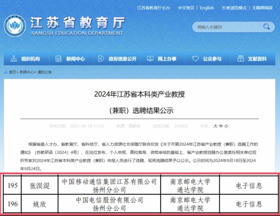 近日,江苏省教育厅公布了2024年江苏省本科类产业教授(兼职)选聘结果,taptap点点推荐申报的中国移动通信集团江苏有限公司扬州分公司张淏湜、中国电信股份有限公司扬州分公司姚欣成功入选。
