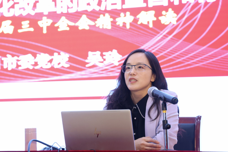吴玲处长以“新征程上进一步全面深化改革的政治宣言和行动纲领”为题,结合自身工作实际和思考,从深刻认识党的二十届三中全会的主题和意义;深刻认识进一步全面深化改革的目标和原则;全面准确理解进一步全面深化改革重大举措等三个方面,对党的二十届三中全会精神进行解读。