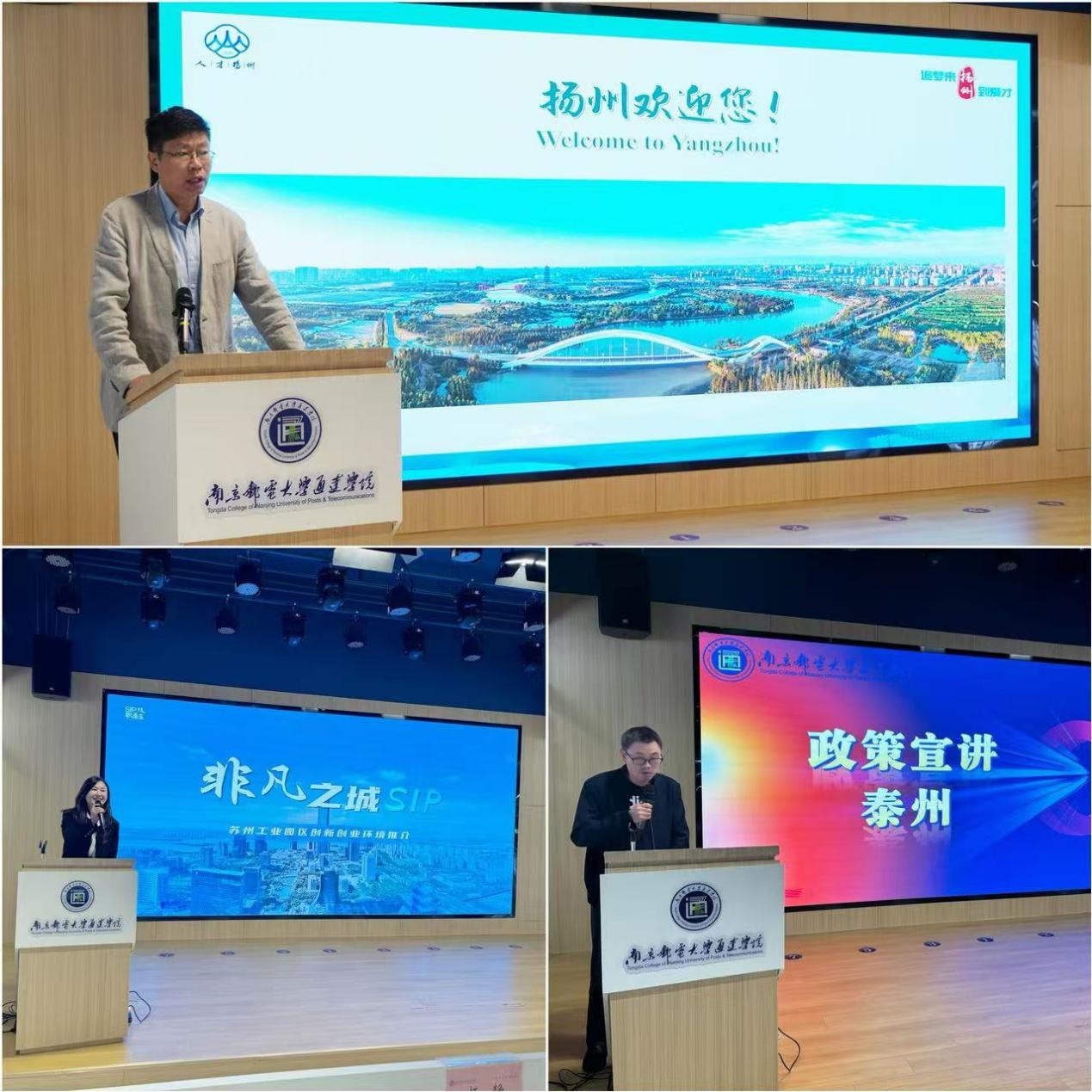 招聘活动同时,学院在创新创业中心路演大厅设立政策和招聘宣讲专区,邀请扬州、泰州、苏州工业园区3个地区人才服务中心及3家重点企业,宣讲就业创业政策、产业和企业发展状况以及针对2025年高校毕业生的招聘安排。扬州市人力资源市场管理办公室主任赵斌亲临现场为taptap点点同学推介扬州,讲解扬州吸引人才政策。