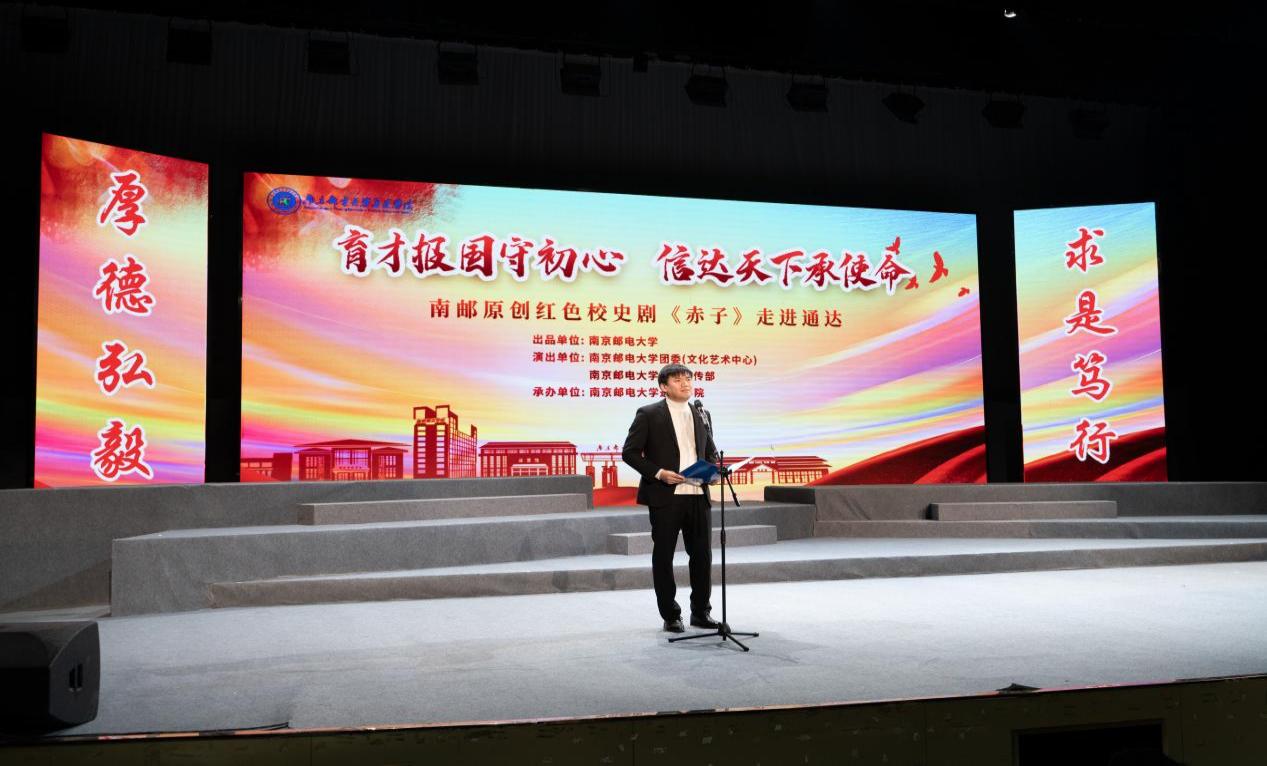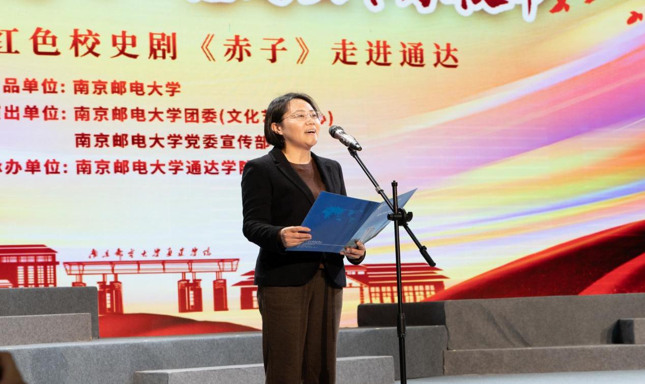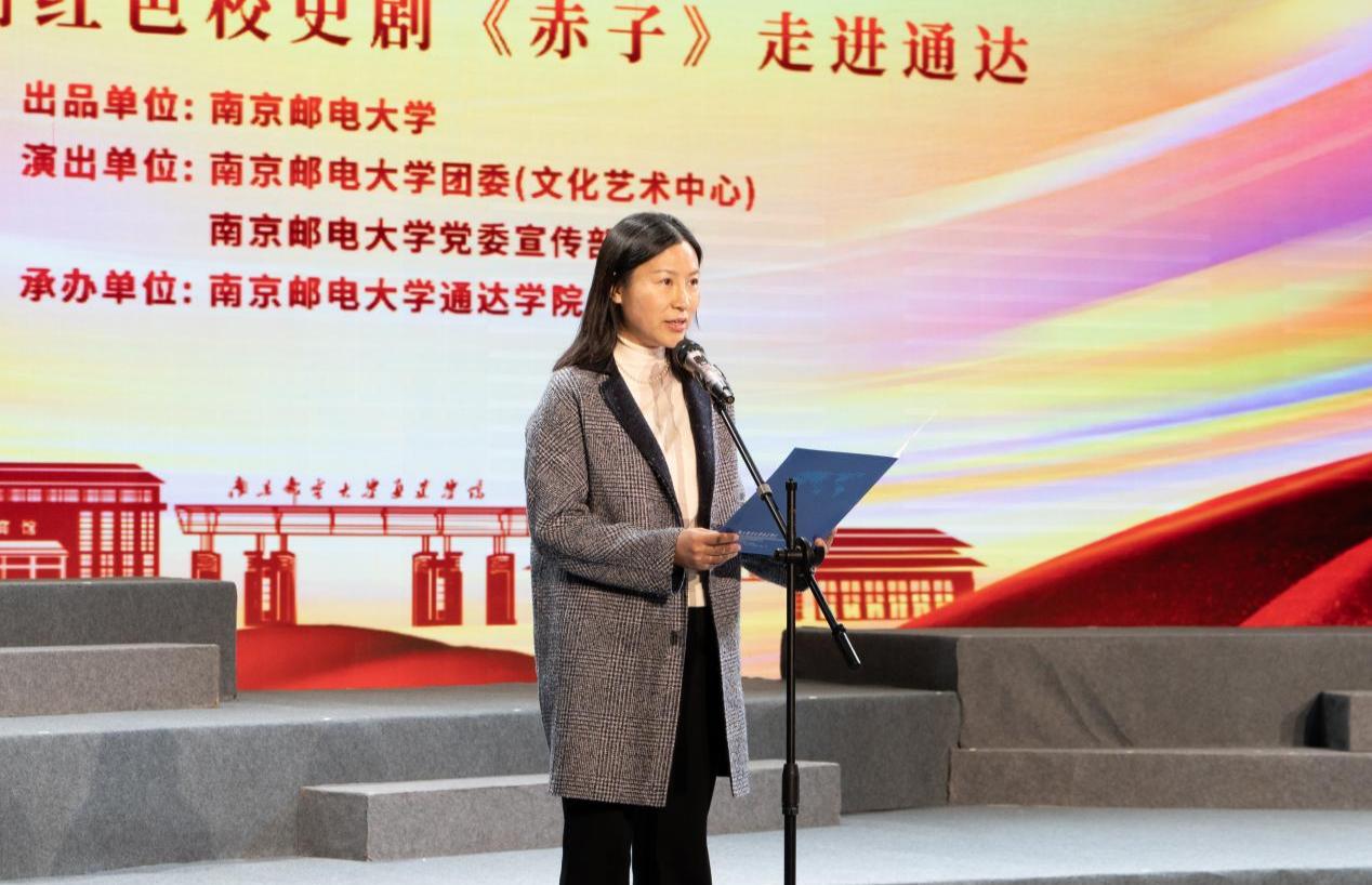 南京邮电大学党委常委、宣传部部长张敏在仪式上讲话。她指出由南邮师生倾情演绎的原创红色校史剧《赤子》生动展现了一代又一代南邮人因邮电而生、随通信而长、由信息而强的奋斗历程,深刻诠释了南邮人坚定不移的信念与不懈追求的精神风貌。她表示南邮始终坚持将以美育人、以美化人、以美培元作为立德树人的重要体现,充分运用好南邮红色资源,以精品力作为媒介,讲好南邮故事,传播南邮声音。