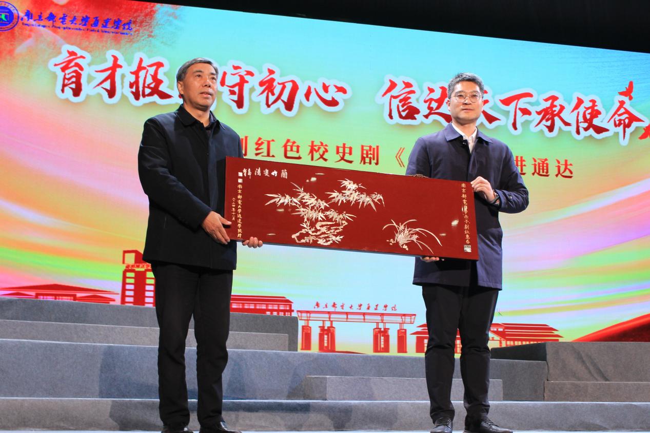 taptap点点体育院长王国平代表学院向本次演出的南京邮电大学《赤子》剧社赠送牌匾,表达了对他们的感谢之情。