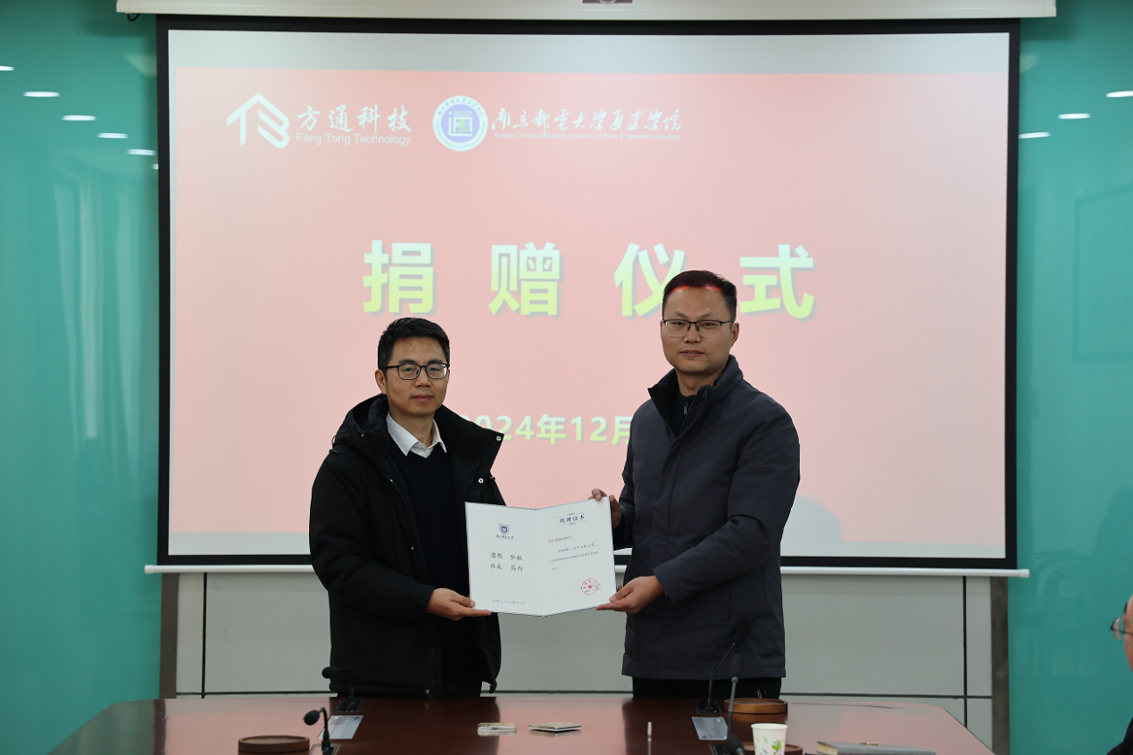 南京邮电大学教育发展基金会办公室副主任王楷向方通公司颁发捐赠证书