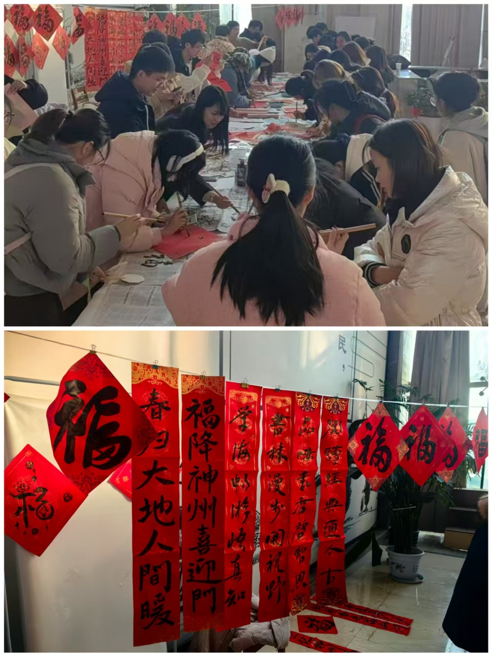 现场,党委书记赵允玉在亲切地与同学们互动,和大家一起写福字、写对联,制作书签和团扇,交流各地的新年习俗,并对同学们的作品给予高度评价和赞赏。同学们的脸上洋溢着快乐的笑容,新春的气息似乎也随着这些心意迅速弥漫在整个校园。