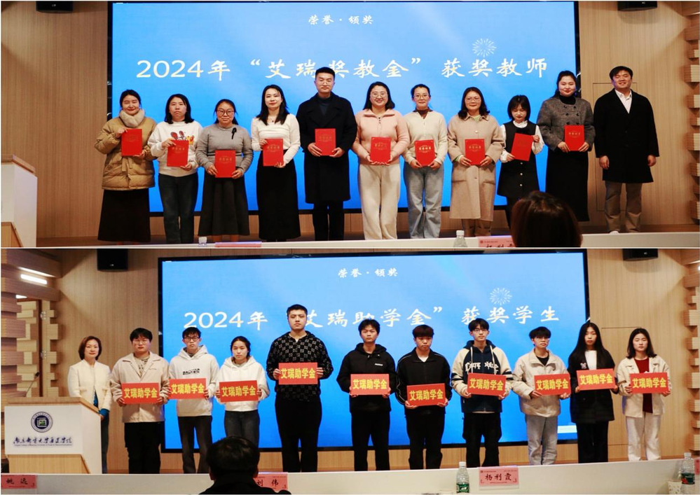 学生工作处处长宣读“艾瑞奖教金”“艾瑞助学金”评选决定,院党委副书记兼副院长刘伟为获得“艾瑞奖教金”的辅导员颁奖;南京艾瑞集团董事长杨利霞为获得“艾瑞助学金”的学生颁奖。