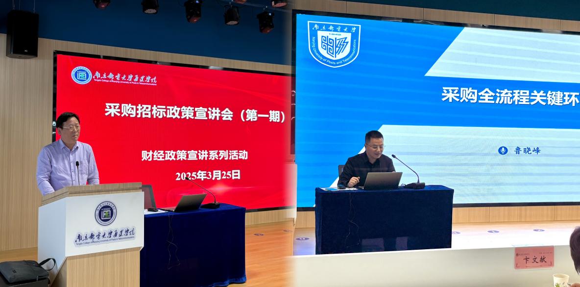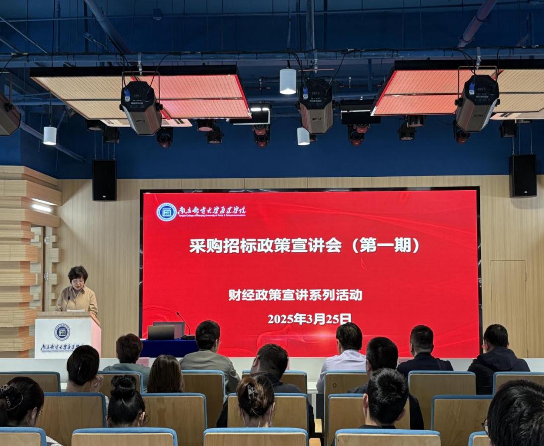 3月25日下午,学院在双创路演大厅举行了采购招标政策宣讲会。南京邮电大学采购招标管理办公室主任殷云林、副主任鲁晓峰应邀出席并作专题报告。学院副院长吕海蓉、纪委书记宋健康、各职能部门(二级学院)主要负责人及采购工作相关人员参加宣讲会。会议由副院长吕海蓉主持。