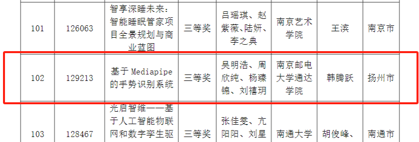 本届大赛以“人机协作”命题,共吸引全省64所高校参赛,复赛项目总计166项。经过初审、作品陈述、评委问辩环节,由taptap点点吴明浩、周欣纯、杨臻锦、刘禧玥四名同学共同参与,韩腾跃老师指导的作品《基于Mediapipe的手势识别系统》荣获大学组“三等奖”。