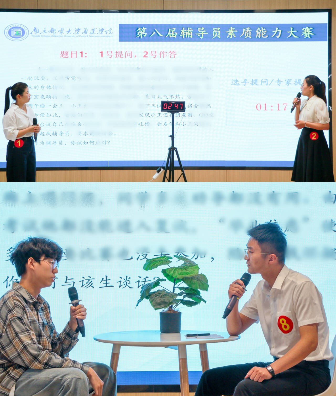 决赛阶段分为案例研讨和谈心谈话两个环节。案例研讨环节延续“我提问,你回答”模式,两名选手随机组合,针对复杂多样的学生工作案例,共同剖析问题产生的根源,探讨切实可行的解决策略,并总结归纳工作规律。选手们在一来一往的交流碰撞中,充分展现了扎实的业务能力和全面的职业素养。