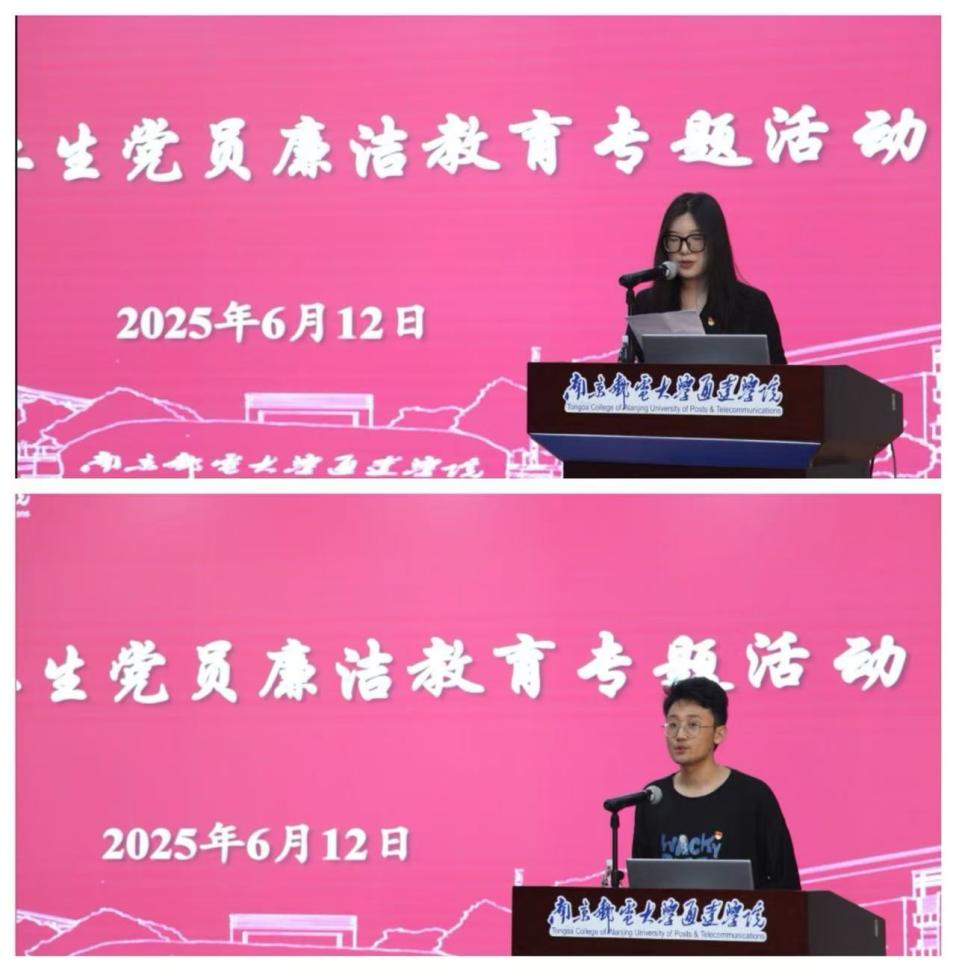 电子工程学院、计算机工程学院的两位同学作为毕业生党员代表发言。他们简要回顾了自己在校期间参与的一些主题党日活动和廉洁教育活动,并结合学习、生活分享了各自对廉洁的理解与感悟,强调了践行廉洁理念、勇担时代使命的重要性,表明了对廉洁从业的坚定态度和对自身责任的清晰认知,展现出共产党员应有的政治本色和担当精神。
