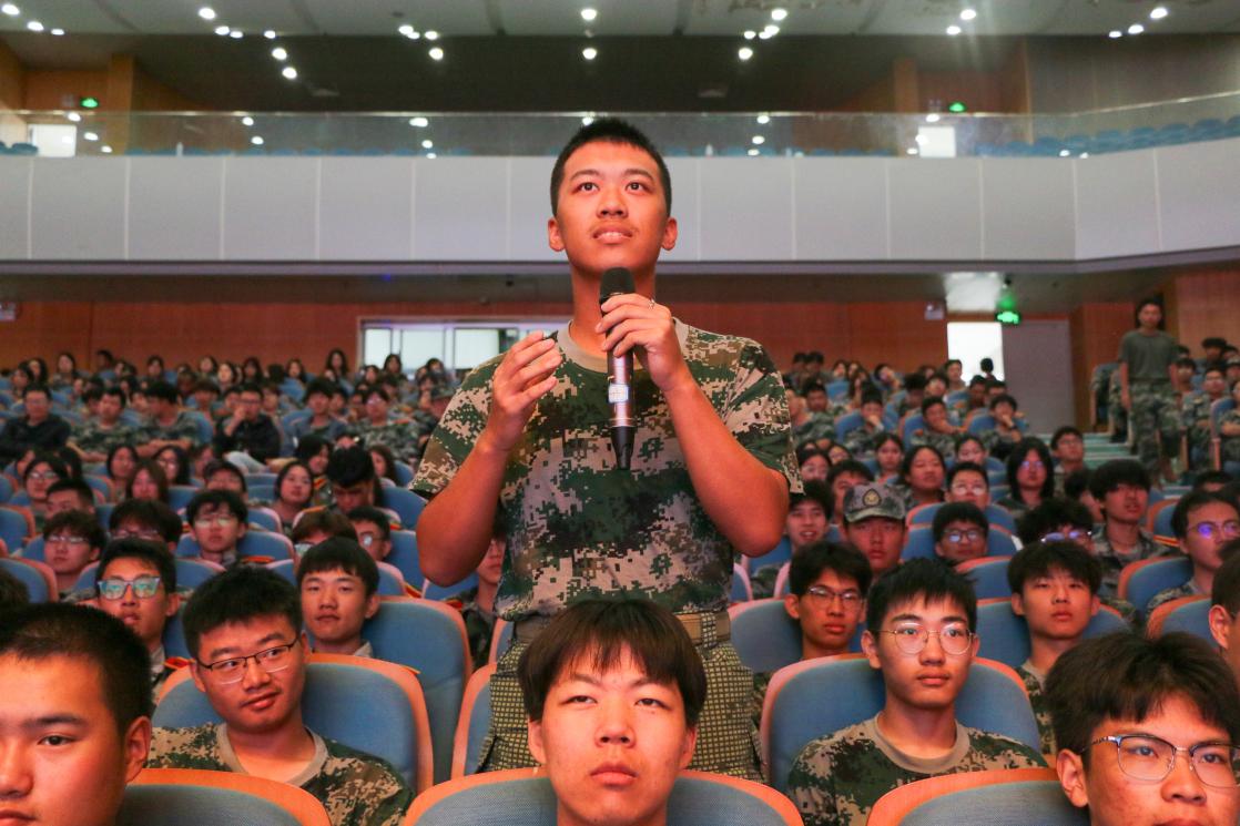 报告开篇,王淑仪以互动拉近距离,询问新生们“军训感受如何”“最擅长哪个训练科目”“能轻松站20分钟军姿吗”,现场学生踊跃回应、气氛热烈。随后她与新生们分享了她参与民兵方阵受阅的经历,讲述自己寒冬里练军姿,酷暑中反复操练,哪怕汗水浸透衣衫,仍始终盯着“每一步75厘米,踢腿30公分”的标准反复打磨动作、力求完美,最终与来自15个省份的战友们一同身着21式荒漠迷彩服、系着红丝巾,以“米秒不差”的整齐步伐走过长安街的故事。新生们现场积极分享观阅感受,不少新生直言“震撼又自豪”。