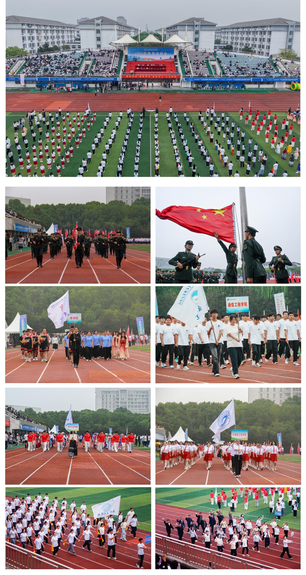运动会在激昂的《运动员进行曲》中正式拉开帷幕。国旗院旗护卫队步伐铿锵,彩旗方阵意气风发,紧随其后的是各二级学院运动员方阵依次登场,成为场上最亮丽的风景线。他们迈着整齐划一的步伐,高喊着独具特色的口号,依次通过主席台接受检阅。每一个方阵都带着独特的创意与饱满的热情,展现出各学院的专业特色与精神风貌。