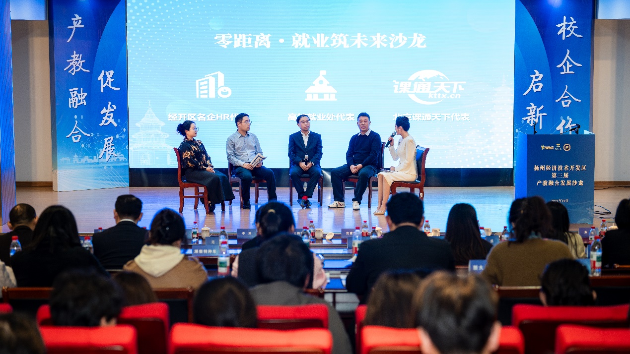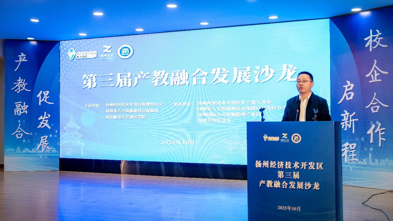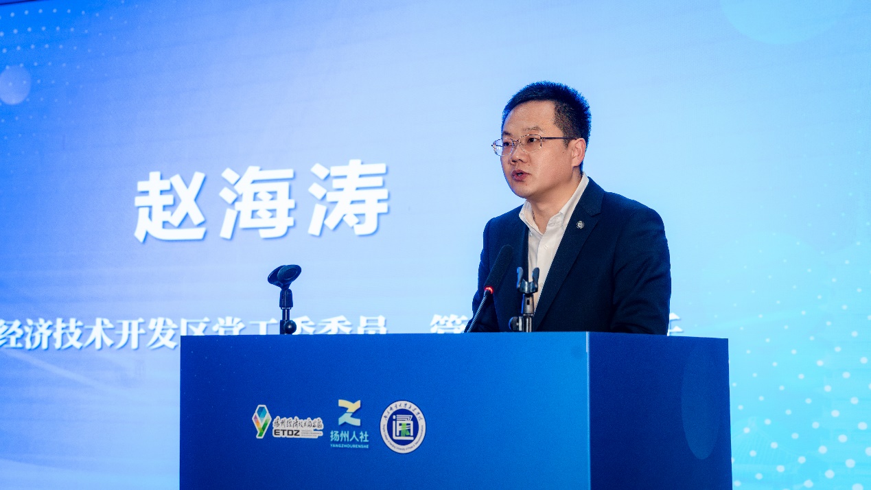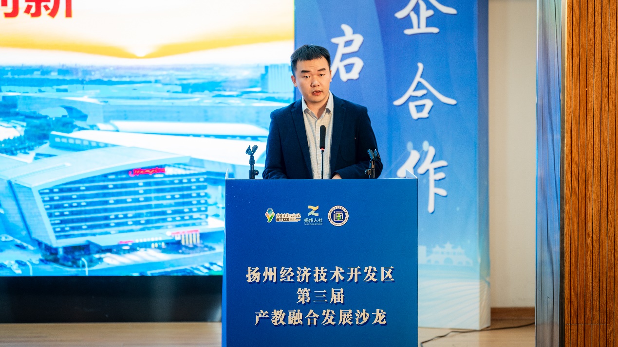 赵海涛在致辞中简要介绍了扬州经开区产业发展情况,他期盼通过搭建的沙龙平台,破解“企业求才若渴、院校育人有惑”的痛点,并就产教融合要义对院校、企业、政府部门提出了新的期盼。