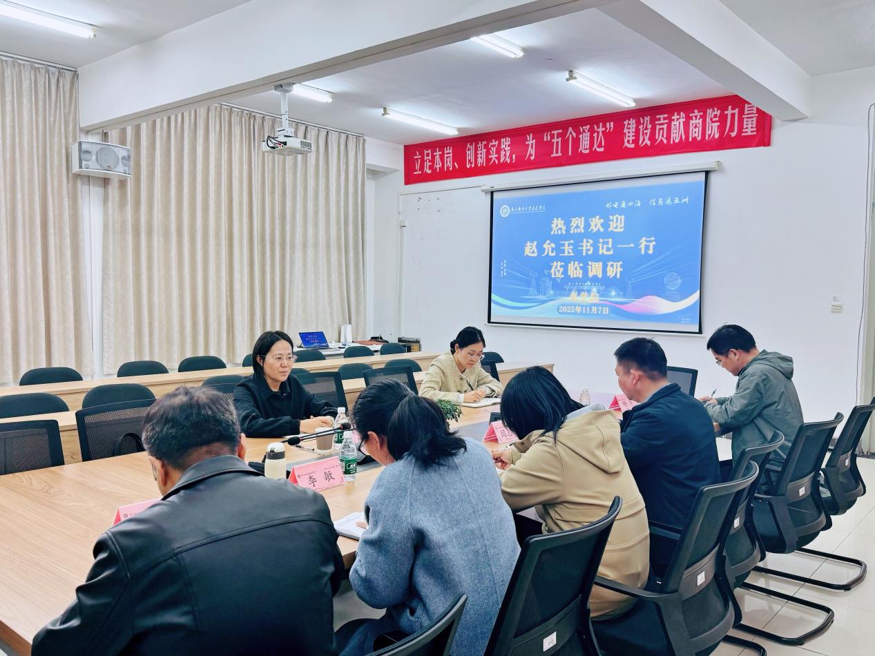 11月7日下午,学院党委书记赵允玉一行莅临商学院调研指导工作,深入了解商学院发展现状、改革创新思路及当前面临的主要问题与挑战。商学院负责人及各教研室负责人参加调研会。调研会由商学院党总支书记主持。