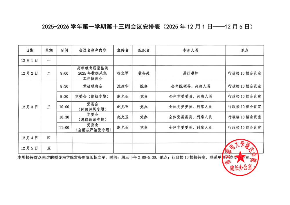 2025-2026学年第一学期第十三周会议安排表