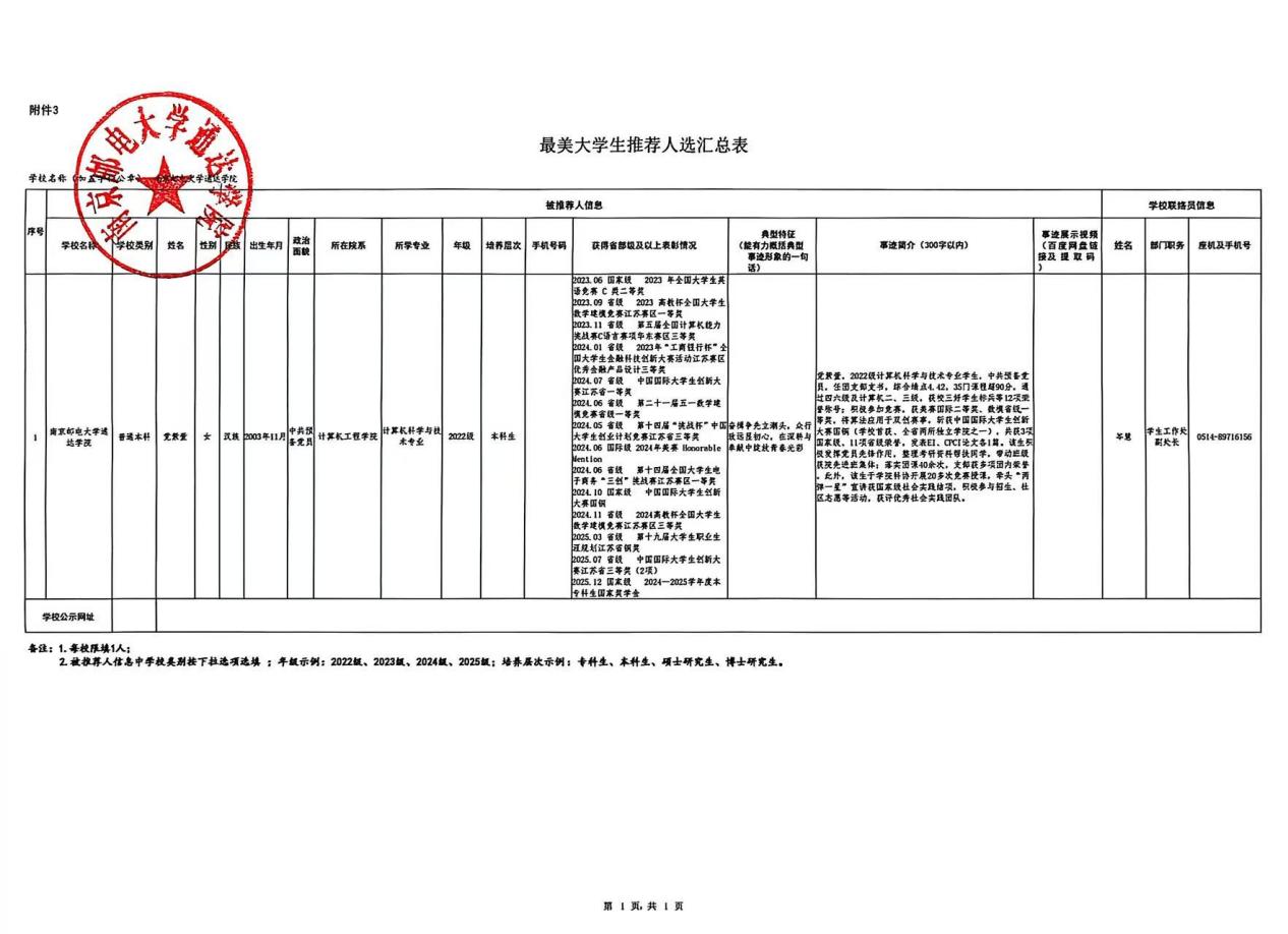 根据《省教育厅办公室关于转发教育部办公厅开展“最美高校辅导员”和“最美大学生”推选展示活动的通知》,经个人申报、二级学院考察推荐、学生工作处审核、专家组评议、院领导审定,拟确定计算机工程学院2022级计算机科学与技术专业学生党紫萱为taptap点点“最美大学生”推荐人选,上报省教育厅遴选,现予公示。